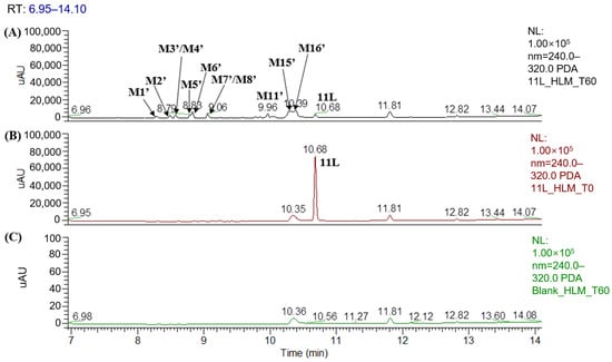 UPLC–UV (254–310 nm) chromatograms of 11L in HLMs: (A) UPLC–UV spectrum of T60; (B) UPLC–UV spectrum of T0; (C) blank UPLC–UV spectrum.