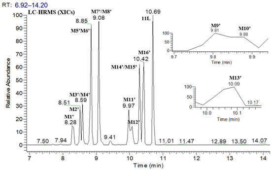 Mass Spectrometric Method: The electrospray ionization source parameters were set as follows: capillary temperature, 375 °C; spray voltage, 3.5 kV (+), 3.0 kV (−); sheath gas flow rate, 40 L/h; auxiliary gas flow rate, 15 L/h; auxiliary gas heater temperature, 300 °C; S-Lens voltage, 55 V. The data were collected in the m/z range of 140–1400 Da (+, full mass scan), 120–1400 (−, full mass scan), and 200–2000 Da (MS/MS scan) in centroid mode. The collision energy was 10/15/20 V (+), 10/20/30 V (−). The mass resolutions for full mass scans and MS/MS scans were chosen to be above 60,000 and 15,000, respectively. Collision-induced dissociation (CID) was utilized to attain the MS/MS fragment of 11L and its metabolites.