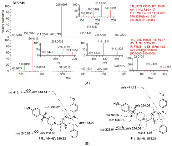 (A) CID mass spectrometry of 11L; (B) analysis of mass spectrometry fragments (positive ion, m/z 580.2224; negative ion, m/z 578.2077). The major fragment ions of 11L without metabolism are positive ions at m/z 443.1384, 296.0697, 268.0749, 138.0914, and negative ions at m/z 441.1228, 311.0818, 294.0552, 254.0602, 156.0116, 92.0495.