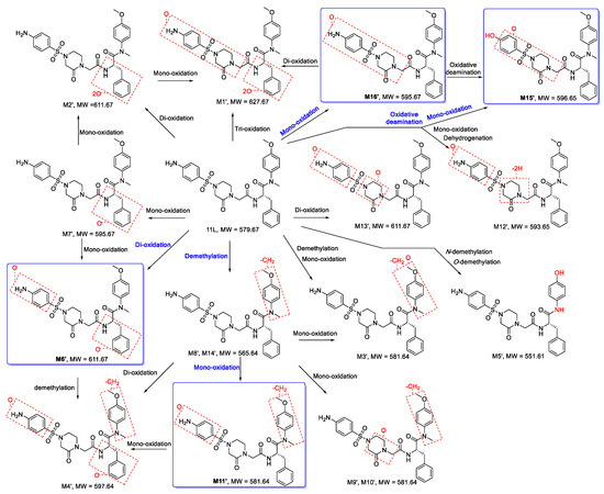 Proposed metabolic pathways of 11L in HLMs. The main pathways are highlighted in blue.