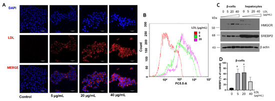 LDL endocytosis in β-cells is associated with the alteration of cholesterol targets. (A) RIN-m5F cells were treated with increasing concentrations of dil-LDL (0–40 µg/mL), representative images showing Hoescht (blue), dil-LDL (red), and merge for each treatment. (B) Flow cytometry analysis of dil-LDL endocytosis (0–20 µg/mL), under incubation for 20 h. PBS was used as a vehicle. (C) Effect of LDL treatment (0–40 µg/mL) on the expression of HMGCR and SREBP2 in β-cells, hepatocytes were evaluated as a control. (D) Densitometry analysis of SREBP2 in β-cells, results are reported as mean ± SD (n = 3), * p < 0.05 concerning control. β-actin was used as a loading control.