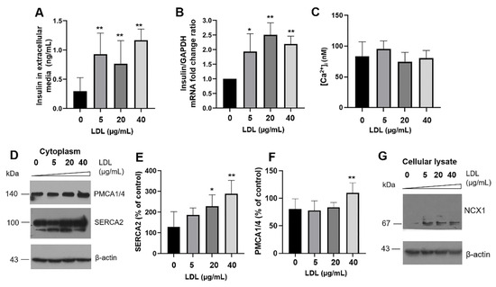 Insulin secretion promoted by LDL is associated with the modulation of targets controlling intracellular calcium levels. (A) Effect of LDL treatments (0–40 µg/mL) on insulin secretion (n = 3, mean ± SD), ** p < 0.005. (B) Evaluation of insulin mRNA expression under the same LDL concentrations and 20 h of treatment, qPCR reactions were performed for triplicate, and GAPDH was used as a reference calibrator. Results are reported as mean ± SD (n = 3), * p < 0.05, ** p < 0.005. (C) Quantification of intracellular Ca2+. (D) Expression of PMCA1/4 and SERCA2 on cytoplasm lysates, representative Western blots are showed; quantitative characterization of the (E) SERCA2 and (F) PMCA1/4 expression (n = 3, mean ± SD), * p < 0.05, ** p < 0.005. (G) Western blot of NCX1 in cellular lysates; β-actin was used as a loading control.