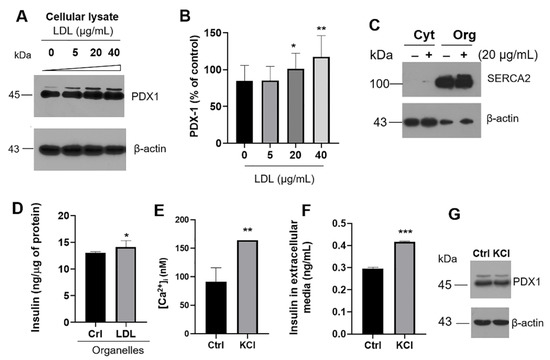 To explore into the mechanisms inducing the increment in LDL-dependent insulin secretion, the expression of pancreatic and duodenal homeobox 1 (PDX-1) was evaluated. PDX-1 is the critical transcription factor for insulin expression and, with the gene BETA2, is associated with β-cell proliferation [38]. LDL treatment (0–40 µg/mL) induced an increase in the levels of PDX-1 (Figure 3A,B). To assess whether insulin mRNA and extracellular-insulin levels correlated with an increase in the intracellular concentration, we performed two methodologies for the isolation of several organelles. We showed the results obtained in cytosolic and organelles fractions, where targets such as ER-SERCA2 were evaluated as a control (Figure 3C). The insulin quantification in organelles suggests that LDL treatment (20 µg/mL) promoted an increment (Figure 3D). This phenomenon could explain the effects registered in the insulin mRNA levels and secretion; therefore, the impact of cholesterol overload could be mediated through PDX-1.