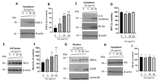 In β-cells, activation of UPR induced by LDL is connected with inflammatory markers. (A) COX-2 expression under the LDL treatment (0–40 µg/mL) for 20 h in cytoplasm. Tunicamycin (Tum, 1 µg/mL) was used as an ER-stress inducer. (B) Densitometry analysis of COX-2, results are reported as mean ± SD (n = 3) and expressed as % of control, * p < 0.1, ** p < 0.0005. (C) IL-6 and NF-κB expression under LDL increasing concentrations. (D) Effect of LDL treatment (0–40 µg/mL) on β-cell viability, results are reported as mean ± SD (n = 6), * p < 0.05. (E) Under the same conditions, expression of apoptosis regulator, Bcl-2; (F) quantitative characterization of the Bcl-2 expression (n = 3, mean ± SD), * p < 0.05, ** p < 0.005. (G) Western blot of the UPR targets XBP1s and CHOP under LDL stimuli (0–40 µg/mL) in nucleus isolates. Lamin B1 was used as a loading control. Tunicamycin (Tum) was used as a control (1 µg/mL). (H) PDI expression levels under the LDL treatment. (I) Densitometry analysis of PDI, results are reported as mean ± SD (n = 3) and expressed as % of control. In panels A, C, E, and H, β-actin was used as a loading control.