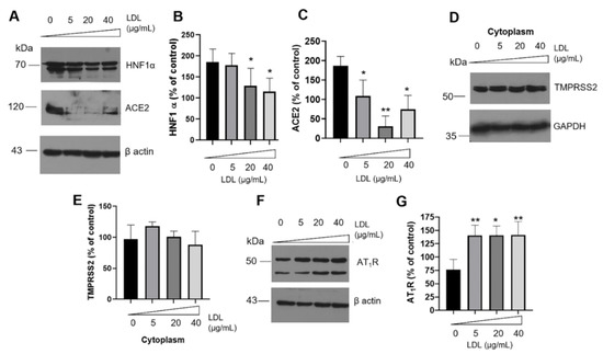 Effect of LDL treatment on renin–angiotensin system (RAS). (A) Western blot of HNF1α and ACE2 under increasing concentrations of LDL (0–40 µg/mL) at 20 h treatment. Quantitative characterization of HNF1α (B) and ACE2 (C), results are expressed as % of control, * p < 0.05, ** p < 0.005 (n = 3, mean ± SD). (D) Under the same experimental condition, expression of TMPRSS2 on cytoplasm extracts; (E) densitometry analysis of TMPRSS2 (n = 3, mean ± SD). GAPDH was used as a loading control. (F) AT1R expression levels under LDL incubation. (G) Densitometry analysis of AT1R, results are expressed as % of control, * p < 0.05, **p < 0.005 (n = 3, mean ± SD). In panels (A,F), β-actin was used as a loading control.