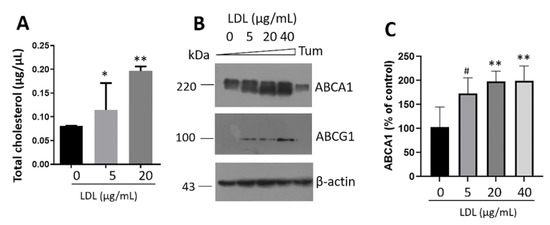 LDL treatment promotes the intracellular accumulation of cholesterol and triggers ABCA1 and ABCG1 expression. Intracellular cholesterol concentrations (A) on fat droplets under treatment with LDL (0–20 µg/mL) at 20 h. Results are reported as mean ± SD (n = 3), * p < 0.1, ** p < 0.005. (B) Western blot of cholesterol transporters ABCA1 and ABCG1. β-actin was used as a loading control. Tunicamycin (Tum) was used as a control (1 µg/mL). (C) Densitometry analysis of ABCA1, results are reported as mean ± SD and expressed as % of control (n = 3), # p < 0.05, ** p < 0.005.