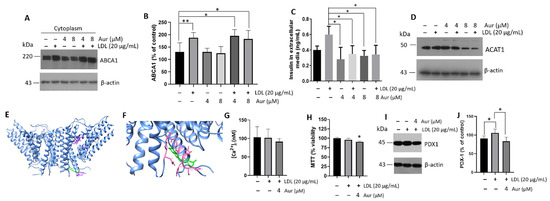 In addition, by employing in silico experimentation on an ACAT structure (PDB: 6L47), molecular docking results suggest the interaction of Aur with the residues Arg350, Asn351, Tyr523, Arg525, Gln526, His527, Cys528, and Pro529 (Figure 7E,F). The Aur molecule could move away from the active site of ACAT when exposed to the solvent, which does not allow the interaction of Aur with the crucial catalytic residues within the active site (H460, N421, and W420) [59]. The crystal structure of ACAT1 reveals a tetramer integrated by a dimer with a symmetric rubber raft shape. Each subunit comprises nine transmembrane helices, showing a disulfide bond (C528 and C546) that is not modified by the interaction with Aur [59,60]. An inhibitory phenomenon on cholesterol esterification could occur, inducing higher levels of free cholesterol for cellular exportation and impacting the ABCA1 activity (Figure 7). Strategies such as ACAT inhibition showed relevant functions regulating the β-cell physiology. Under the concentration evaluated (4 µM), Aur did not affect the intracellular calcium levels (Figure 7G) and only a subtle difference in cellular viability concerning the controls was registered (Figure 7H). Moreover, we have shown the cellular effect of Aur in a range of 4–16 µM on the expression of ABCA1. However, we have restricted ourselves to the lowest Aur 4 µM concentration. Our data suggest Aur modulates PDX-1 activation under the LDL treatment (Figure 7I,J), showing that Aur induces the regulation of insulin secretion by PDX-1. The results point out the role of Aur in metabolism regulation [61].
