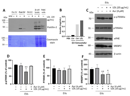 The effect of extracellular vesicles (EVs) in β-cells on insulin signaling in hepatocytes. (A) Characterization of the purity of EVs isolated in extracellular media of β-cells was carried out through several steps; flotillin-2 was used as a marker. Pre-EVs: extracellular vesicles at 0 h; Post-EVs: extracellular vesicles at 20 h; FM-EVs: free medium of extracellular vesicles. β-cells and triple-negative breast cancer cells (TNBC) lysates were used as controls. In addition, Coomassie stain was performed on PVDF membranes. (B) Insulin quantification in EVs samples and extracellular media of β-cells employing the ultrasensitive insulin ELISA assay. (C) Characterization of insulin signaling in hepatocytes by p-p70S6kα, p70S6kα, eIF4E, and SREBP2 under the treatment of EVs derived from β-cells incubated with LDL (20 µg/mL) and concomitant Aur (4 µM) treatment, respectively. PBS was used as a control. Densitometry analysis of p-p70S6kα (D), p70S6kα (E), and SREBP2 (F). Results are reported as mean ± SD (n = 3) and expressed as % of control, * p < 0.05, ** p < 0.01.