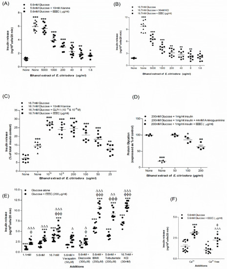 Effects of EEEC on insulin secretion from (A,B) clonal pancreatic β-cells (BRIN-BD11) and (C) islets of Langerhans, (D) glycation of protein, (E) secretion of insulin with known stimulators or inhibitors and (F) plus or minus extracellular calcium from clonal β-cells. Values n = 8 and 4 for insulin secretion and n = 3 for glycation of protein are mean ± SEM. * p < 0.05, ** p < 0.01 and *** p < 0.001 compared to control. ϕ p < 0.05 and ϕϕϕ p < 0.001 compared to 5.6 mM glucose with EEEC. Δ p < 0.05, ΔΔ p < 0.01 and ΔΔΔ p < 0.001 compared to respective incubation without EEEC. EEEC, Ethanol extract of E. citriodora.