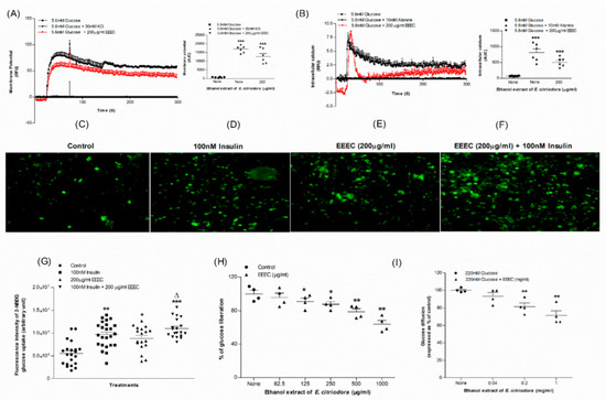 Effects of EEEC on (A) membrane potential and (B) intracellular calcium in clonal pancreatic β cell (BRIN BD11) and, (C–G) glucose uptake, (H) starch digestion and (I) glucose diffusion in vitro. Changes of fluorescence intensity in differentiated 3T3L1 adipocyte incubated with EEEC (E) minus or (F) plus 100 nM insulin. The ×10 magnification was used to take the images. Values n = 6 for membrane potential and intracellular calcium, n = 4 for uptake of glucose, digestion of starch and diffusion of glucose are mean ± SEM. * p < 0.05, ** p < 0.01, and *** p < 0.001 compared to control. Δ p < 0.05 compared to insulin alone.