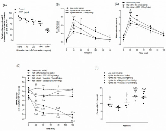 The effects of EEEC on the DPP-IV enzyme were measured in plasma using a fluorometric assay, as reported previously [25]. After oral gavage of EEEC (250 mg/5 mL/kg), DPP-IV inhibitors sitagliptin (10 mol/5 mL/kg) and vildagliptin (10 mol/5 mL/kg), or saline control, blood samples were collected from rats fed a high-fat diet at certain times, as indicated in Figure 4D. Using a GLP-1 (Active) ELISA Kit (EGLP-35K, Merck Millipore, Dorset, UK), active GLP-1 (7–36) was measured in plasma samples collected at 30 min.