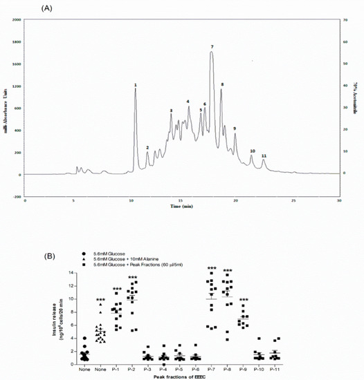 Representative (A) HPLC profile and (B) insulin-releasing effects of peak fractions (1,2,7-9) of EEEC. Crude extract was chromatographed at a flow rate of 1.0 mL/min on a (10 × 250 mm) semi-preparative 5 μm C-18 column (Phenomenex, UK). Using linear gradients of acetonitrile (0–20% up to 10 min, 20–70% up to 40 min), the concentration of the eluting solvent was increased. Compounds were detected by measurement of absorbance at 254 nm. Peak fractions 1, 2 and 7–9 were collected and insulin-releasing activity assessed using BRIN-BD11 cells. Values n = 8 for insulin release are mean ± SEM. *** p < 0.001 compared to control.