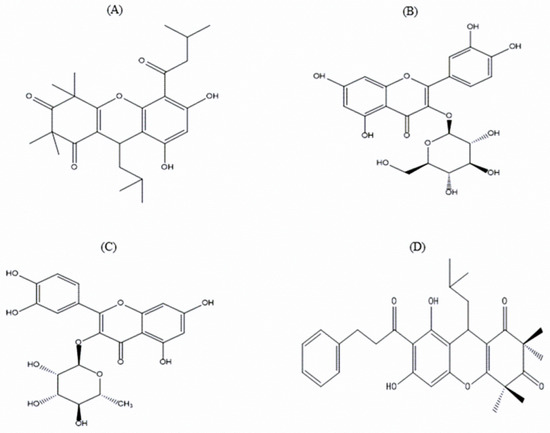 Chemical structure of possible phytoconstituents extracted from the EEEC. Chemical structures of (A) Rhodomyrtosone B, (B) Quercetin-3-O-β-D-glucopyranoside, (C) Quercitroside and (D) Rhodomyrtosone E with their corresponding molecular formulae: C26H34O6, C21H20O12, C21H20O11, and C30H34O6.