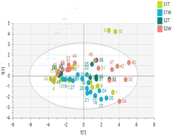 PCA score scatter plot showing component 1, x−axis (PC1 = 54.6%), and component 2, y−axis (PC2 = 14.6%), of H. aureonitens leaves and stems collected during spring and autumn at Telperion and Wakefield. S1T = spring, Telperion; S1W = spring, Wakefield; S2T = autumn, Telperion; S2W = autumn, Wakefield.