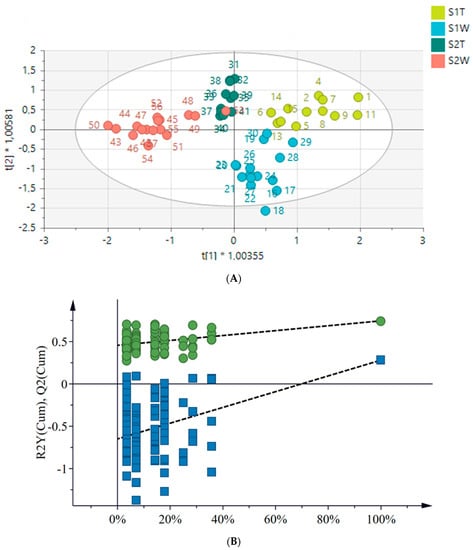 (A) An OPLS-DA score scatter plot showing the predictive (x−axis) and orthogonal (y−axis) components of H. aureonitens leaves and stems during spring and autumn at Telperion and Wakefield. R2X = 0.905, R2Y = 0.727 and Q2 = 0.384. S1T = spring, Telperion; S1W = spring, Wakefield; S2T = autumn, Telperion; S2W = autumn, Wakefield. (B) The response permutation test (n = 100) for the OPLS-DA model corresponding to y-axis intercepts. R2 = (0.0, 0.46) and Y2 = (0.0, −0.65).