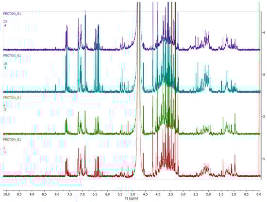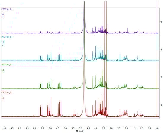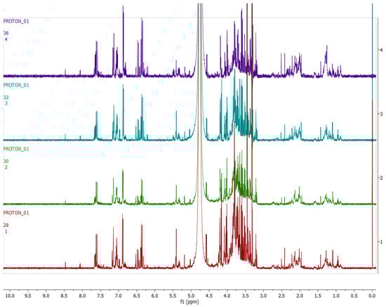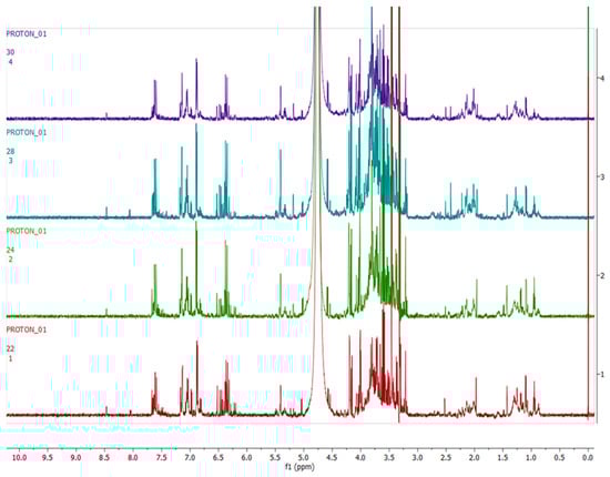 Figure 10 shows representative 1H-NMR spectra of H. aureonitens plant extracts demonstrating the chemical profile of wet sites compared to the dry site for the spring season in Wakefield. The peaks in the aromatic region (6.5–8.0 ppm) of site 1 (wet) are significantly different from the peaks of site 4 (dry) by visual observation. The peaks for site 2 (wet but not as wet as site 1) are slightly similar to the peaks for site 3 (dry, but not as dry as site 4). The two sites with contrasting moisture, i.e., sites 1 and 4, show a noteworthy difference, indicating the presence of higher concentrations of bioactive compounds in the wet site.