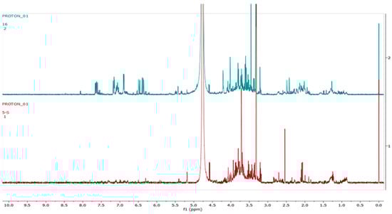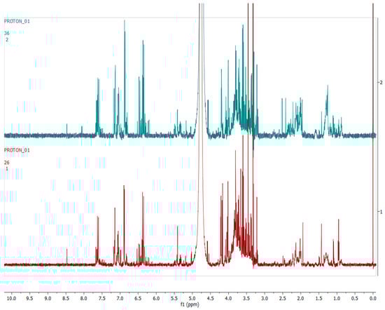 Comparison between samples harvested from dry sites in the autumn season across the two locations on the basis of 600 MHz 1H-NMR spectra of H. aureonitens leaf extracts. Red—autumn season, site 3 (dry) Telperion; light blue—autumn season, site 3 (dry) Wakefield.