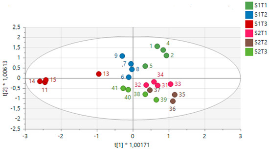 OPLS-DA score scatter plot of H. aureonitens leaf extracts collected from the wet and dry sites at Telperion during both spring and autumn seasons. R2X = 0.948, R2Y = 0.715 and Q2 = 0.024. Green (S1T1) = spring site 1(wet); blue (S1T2) = spring site 2 (wet); red (S1T3) = spring site 3 (dry); pink (S2T1) = autumn site 1 (wet); brown (S2T2) = autumn site 2 (wet); olive (S2T3) = spring site 3 (dry).