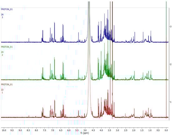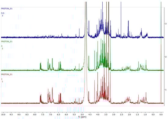 The 600 MHz 1H-NMR spectra of H. aureonitens leaf extracts collected from the wet and dry sites at Telperion during the spring season. Red = site 1 (wet); green = site 2 (wet); blue = site 3 (dry).