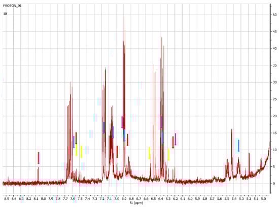 Peaks of the annotated compounds indicated for each of the compounds. Yellow = galangin (8.06, 7.58, 7.49, 6.54, 6.28 ppm); purple = kaempferol (8.06, 6.94, 6.44, 6.20 ppm); blue = chlorogenic acid (7.56, 7.06, 7.03, 6.83, 6.22, 5.33 ppm); red = quercetin (7.66, 7.54, 6.88, 6.20 ppm).