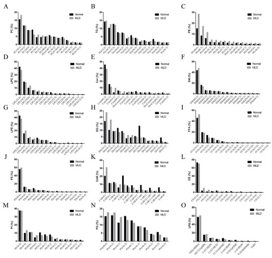 For the lipidomics analysis, the total lipids were extracted from the liver in the Normal and MLD groups. Liver tissues (20 mg) were homogenized in a 2 mL centrifuge tube with 1 mL extracting solution (methyl tertiary butyl ether: methyl alcohol = 3:1, v/v, including internal standard mixture). After homogenization, 200 μL deionized water was added and then centrifuged for 10 min at 12,000× g r/min, 4 °C. The supernatant solution was dried under nitrogen and redissolved in 200 μL mobile phase B for further analysis.