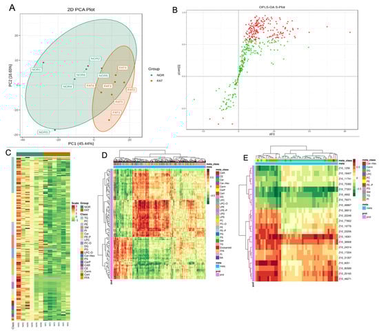 The lipidomics analysis of largemouth bass liver. (A) Principal component analysis (PCA) score plots. (B) OPLS-DA analysis (red points and green points represent VIP ≥ 1 and VIP ≤ 1, respectively) and (C) heatmap. (Mean ± SEM, n = 8). (D) Heatmap of all lipids and proteins (red represents high correlation coefficient; green represents low correlation coefficient). (E) Heatmap of correlation coefficient of differential lipids and differential proteins (red represents a positive correlation between proteins and lipids and green represents a negative correlation). Each row and column represents a protein and a metabolite, respectively.