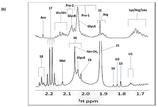 | 16 | 1.95–2.10 | broad/sharp s | Broad: Glycoprotein -NHCOCH3/Sharp: Free Aminosugar- and N-Acetyl-amino acid-NHCOCH3 |