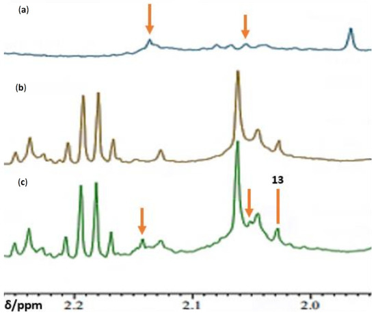 Figure 1a,b show the expanded high- and low-field regions, respectively, of a 600 MHz noesy-presat 1H NMR spectrum of a typical whole-mouth salivary supernatant (WMSS) sample collected from a healthy human participant. In addition to a wide range of resonances arising from bacterial organic anion catabolites such as acetate, lactate, fumarate, propionate, n-butyrate, succinate and formate, etc. (biomolecules predominantly, but not exclusively, arising from the salivary microbiome), these spectra contain many further signals, e.g., amino acids, carbohydrates including N-acetylsugars, purines and pyrimidines, and lipids etc. Also shown are the results of experiments which were set up to investigate spectral quality as a function of the number of 1H NMR scans performed on a single WMSS sample, in this case using both the noesy-presat and WET pulse sequences. Clearly, the spectral quality achieved on our 600 MHz spectrometer was very good, and only small differences between such profiles obtained from the use of only 8 scans, and those acquired using as many as 512 scans were discernible. However, determinations of the signal-to-noise (STN) ratio for the TSP quantitative internal standard and chemical shift reference (δ = 0.00 ppm) revealed an improved sensitivity for the 512-scan profile in noesy-presat spectra acquired, i.e., STN values of 267 versus 1241 for 8 and 512 scans, respectively, i.e., a nearly five-fold enhancement for the latter. However, the achievement of high quality biofluid spectra with only 8 scans here is particularly notable, and this has not been previously reported on WMSS samples.