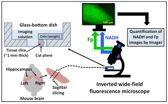 The schematic for ex vivo optical redox imaging of hippocampal slice. Approximately 1 mm thick sagittally cut hippocampal section from a freshly dissected right hippocampus was placed in a 35 mm glass-bottom dish containing imaging solution immediately after slicing. Before imaging, the hippocampal slice was immobilized by a penny coin, with majority of the coin weight resting on the plastic part of the dish bottom. The cut plane was tile-imaged with an inverted wide-field fluorescence microscope equipped with proper optical filters, a 4 × objective lens with a field of view of 2343 × 1849 µm2. The raw images of NADH and Fp were processed and quantified using ImageJ, and subsequently underwent further analyses (see Materials and Methods for details).