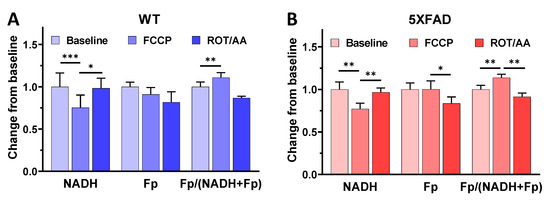 Redox responses of ~1 mm thick hippocampal slices from 2-month-old wild type (A) and 5XFAD (B) mice to the metabolic modulator FCCP followed by rotenone + antimycin A (ROT/AA). Bars represent normalized mean ± SE (before and after drug administration for the same field of view, n = 5 slices/genotype). *, p < 0.05; **, p < 0.01; ***, p < 0.001 (paired t-test).