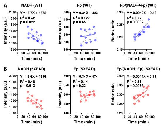 Since there was a time lapse between tissue dissection and imaging, we monitored the redox signals of ex vivo hippocampal tissue sections in the imaging solution (see Materials and Methods for details) for over 1–2 h for each imaging session, then linearly fit the data to obtain the slope and intercept. This allowed us to ensure that all redox data within and across age groups were compared at the same time point. We observed that over time, in both the WT and 5XFAD groups, NADH decreased linearly (p = 0.022, 0.013, respectively), while Fp signals essentially stayed the same, and the redox ratio increased linearly (p = 0.0002, 0.0059, respectively) with similar slopes (Figure 3).