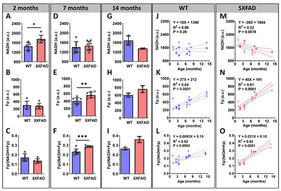 Consistent with these results, the linear regression of NADH, Fp, and the redox ratio with age (Figure 4G–L) showed no significant correlation between NADH and age in the WT hippocampi; however, it did show a significant linear NADH decrease in the 5XFAD hippocampi with advancing age (p = 0.0078). Furthermore, although both Fp and the redox ratio increased linearly with age in both the WT control and 5XFAD model, the rate of increase was larger in 5XFAD mice (Figure 4K). Specifically, the 5XFAD hippocampi showed a significantly larger Fp slope than that of the WT hippocampi (45 versus 27 a.u./month, p = 0.012). Similarly, the redox ratio slope for the 5XFAD hippocampi was more than two-fold greater than that of the WT mice (p < 0.001). We did not observe any difference in the redox indices between male and female mice in either the 5XFAD or WT group.