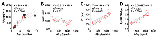 Relationships between Aβ42 level (pg/mL) and redox indices in the 5XFAD hippocampi. (A) a positive linear correlation between Aβ42 level and mouse age; (B) a negative linear correlation between NADH and Aβ42; (C) a positive linear correlation between Fp and Aβ42; (D) a positive linear correlation between the redox ratio and Aβ42.
