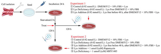 Cells adhered to the wall after inoculation for 24 h, and were then starved for 12 h in the medium without Lys and FBS, and divided into five groups: cultured in the medium with 0.92 mmol Lys for 120 h (Control, CON); cultured in the medium with 0.02 mmol Lys for 120 h (Lys deficiency, LD); cultured in the medium with 0.02 mmol Lys for 48 h; and then cultured in the medium with 0.92 mmol Lys for 72 h (Lys addition, LA); cultured in the medium with 0.02 mmol Lys for 48 h, and then cultured in the medium with 0.92 mmol Lys and 1 μM rapamycin for 72 h (Lys addition + 1 μM Rapamycin, LAR); cultured in the medium with 0.02 mmol Lys for 48 h, and then cultured in the medium with 0.02 mmol Lys and 1 μM MHY1485 for 72 h (Lys deficiency + 1 μM MHY1485, LDM). Cell proliferation was measured at 120 h and the cell samples were also collected at 120 h (Figure 1).