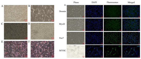 P0 generation cells were inoculated into six-well microplates for immunofluorescence and induction of differentiation identification. Anti-desmin, anti-myogenic differentiation (MyoD), anti-paired box 7 (Pax7), and anti-myosin heavy chain (MYHC) were used; all antibodies came from Cell Signaling Technology (Danvers, MA, USA). Immunofluorescent detection was performed as previously described [21].
