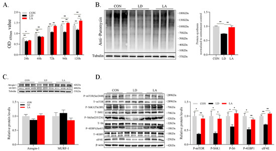 Lysine deficiency attenuates SCs proliferation, protein synthesis, and phosphorylation levels of the mTORC1 signaling pathway. (A) Cell proliferation; (B) representative images of cell protein synthesis levels with Western blotting; (C) representative images of protein ubiquitination level marker protein atrogin1 and MuRF1 expression levels with Western blotting; (D) representative images of phosphorylation levels of mTORC1 signaling pathway-related proteins with Western blotting. * p < 0.05, ** p < 0.01. The data shown represent mean ± SEM of three independent experiments (n = 3).