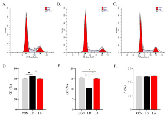 Lysine deficiency causes SCs cycle arrest. (A) CON; (B) LD; (C) LA; (D) G1 phase cell ratio (%); (E) G2 phase cell ratio (%); (F) S phase cell ratio (%). * p < 0.05, ** p < 0.01. The data shown represent mean ± SEM of three independent experiments (n = 3).