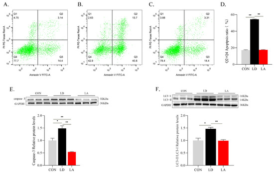 Lysine deficiency results in increased SCs apoptosis rate, apoptosis marker protein caspase-3 expression level and autophagy marker protein LC3-II/LC3-I ratio. (A) CON; (B) LD; (C) LA; (D) apoptosis rate (%); (E) representative images of caspase-3 protein expression levels with Western blotting; (F) representative images of LC3-II/LC3-I protein ratio with Western blotting. * p < 0.05, ** p < 0.01. The data shown represent mean ± SEM of three independent experiments (n = 3).