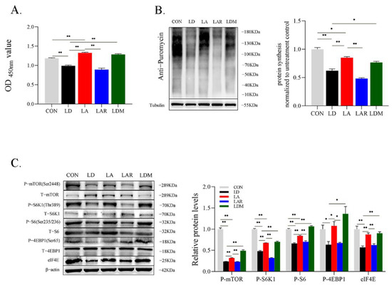mTORC1 signaling pathway is involved in the regulation of SCs proliferation and protein synthesis by lysine. (A) Cell proliferation; (B) representative images of cell protein synthesis levels with Western blotting; (C) representative images of phosphorylation levels of mTORC1 signaling pathway-related proteins with Western blotting. * p < 0.05, ** p < 0.01. The data shown represent mean ± SEM of three independent experiments (n = 3).