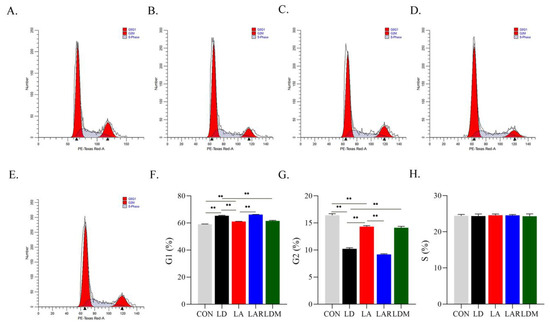 mTORC1 signaling pathway is involved in the regulation of SCs cycle by lysine. (A) CON; (B) LD; (C) LA; (D) LAR; (E) LDM; (F) G1 phase cell ratio (%); (G) G2 phase cell ratio (%); (H) S phase cell ratio (%), ** p < 0.01. The data shown represent mean ± SEM of three independent experiments (n = 3).