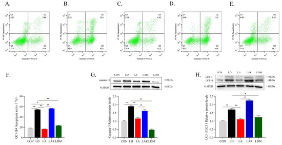 mTORC1 signaling pathway is involved in the regulation of apoptosis and autophagy by lysine. (A) CON; (B) LD; (C) LA; (D) LAR; (E) LDM; (F) apoptosis rate (%); (G) representative images of caspase-3 protein expression levels with Western blotting; (H) representative images of LC3-II/LC3-I protein ratio with Western blotting. * p < 0.05, ** p < 0.01. The data shown represent mean ± SEM of three independent experiments (n = 3).