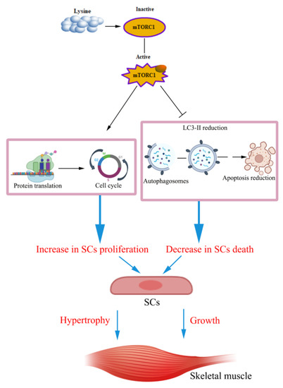 Our findings demonstrate that Lys improves the proliferation, cellular protein synthesis, and the cell cycle in SCs, and inhibits autophagy and apoptosis. Moreover, the mTORC1 signaling pathway mediates these processes. These effects are ultimately be reflected in the growth and hypertrophy of skeletal muscle (Figure 9).