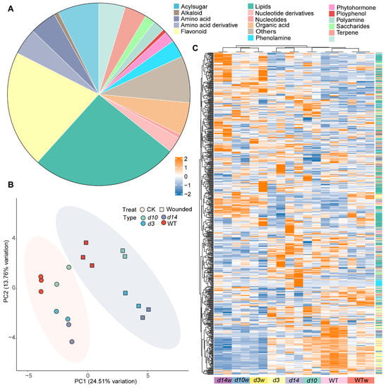 Next, we identified differentially accumulated metabolites (DAMs, |log2fold change (FC)| ≥ 1 and p-value < 0.05) upon wounding. In total, 51, 44, 59, and 35 wounding-responded DAMs were found in d10, d3, d14, and wild-type mutants, respectively (Figure 2A,B). In wild-type plants, JA-lle and JAs displayed the strongest responses to wounding, with a more than 147 and 11-fold increase, respectively. In addition, a series of compounds responded to wounding. In total, 8 out of 21 wounding-upregulated DAMs in wild-type mutants were flavonoids, including 5 tricin derivatives. Meanwhile, wounding depressed the production of 14 metabolites in the wild-type plants, including 4 lipids, 3 amino acids and derivatives, and 2 flavonoids. Nicotinamide-N-oxide and trigonelline were the most significant DAMs, with a more than 93% loss in content after wounding (Table S1).