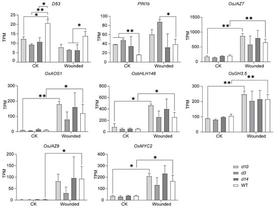 The transcripts per million (TPM) of SLs and JAs pathway-related genes in SLs mutants and wild-type plants before and after wounding. The data were represented as mean ± SD of two biological replicates. The Student’s t-test analysis indicated a significant difference (* p < 0.05, ** p < 0.01).