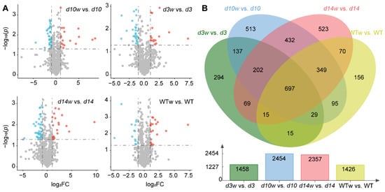 Schematic representation of differentially expressed genes (DEGs) between the mutants and wild type. (A) DEGs in the SLs mutants (d3, d10, and d14) and wild-type plants. (B) Venn diagrams showing DEGs shared by the SLs mutants and wild-type plants. WTw, d3w, d10w, and d14w samples were collected 0.5 h after wounding.
