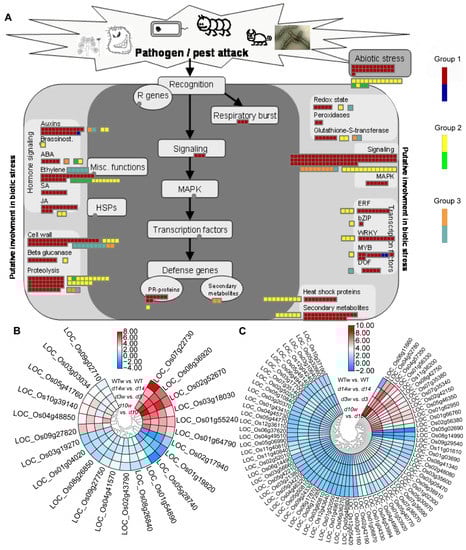 MapMan analysis based “biotic stress pathways” of DEGs in three groups. (A) The schematic diagram of biotic stress categories. The small heatmap in each section of the diagram shows the DEGs mapped to that pathway, and a small square indicates a transcript. Red, orange, and yellow indicate upregulated genes in each group; blue, light sea green, and green means downregulated genes in each group. (B,C) DEGs related to ethylene metabolism (B) and signaling pathway (C). Heatmaps of DEGs were drawn using the log2 (FC) value obtained from the pairwise comparison of samples. Red and blue indicate upregulation and downregulation, respectively.