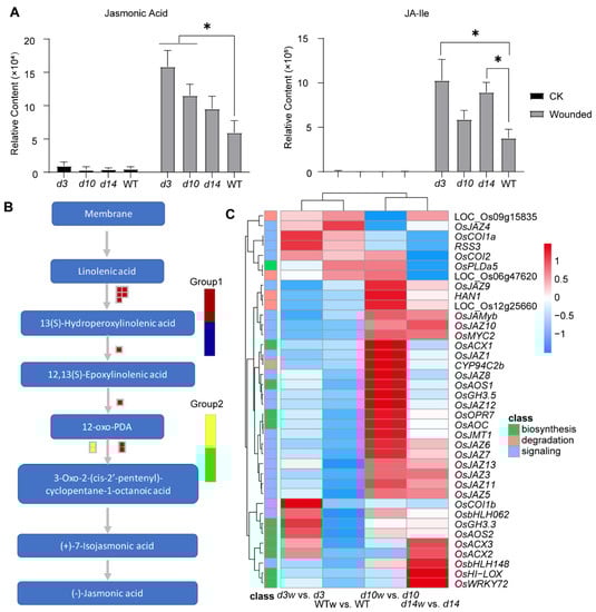 Jasmonates (JAs), a class of oxylipins-derived phytohormone, respond to wounding dramatically. Wounding triggers notable increases (~25-fold) in jasmonic acid (JA) and jasmonyl isoleucine (JA-Ile) contents within 5 min []. The biosynthesis of JAs starts with the release of linolenic acid from phospholipids by phospholipases (PLs) [,,]. Linolenic acid is further subject to oxidation reaction catalyzed by 13-lipoxygenases [] and produces JA by a series of reactions. GH3 (GRETCHEN HAGEN)-family proteins (OsGH3.3/OsJAR2, OsGH3.5/OsJAR1) conjugated JA to Ile or other amino acids [,]. JAs biosynthesis and signaling transduction transcriptionally and metabolically signaling respond to wounding [,].