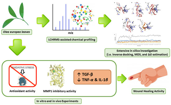 The general summary of the present research is as follows: Olea europaea leaves were extracted, chemical profiling was carried out, and finally the leaves were assessed for their potential wound healing activity by evaluating their antioxidant activity and ability to inhibit MMP1, upregulate TGF-β relative gene expression, and downregulate the relative gene expression of inflammatory cytokines (TNF-α and IL-β1).