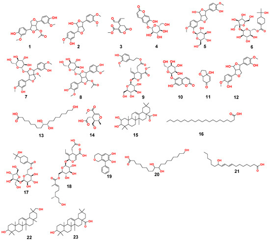 The m/z 223.06055 [M − H]+ and 341.08660 [M + H]+ molecular ion mass peaks, respectively, were characterized for the predicted molecular formulas C11H12O5 and C15H16O9, and indicated S-(E)-elenolide 3 and benzopyrene, 6,7-dihydroxy-2H-1-benzopyran-2-one;6-O-β-d-glucopyranoside 4, respectively, which were formerly separated from OEA [35,38,39]. The ion mass peaks 537.1972, 509.22142 m/z, [M + H]+ for C26H32O12, C22H36O13 predicted molecular formulas, indicated the tertahydrofurofuran lignan nucleus of 7,9′:7′,9-diepoxy-8,8′-lignan-3,3′,4,4′,8-pentol, 3,3′-Di-Me ether,4-O-β-d-glucopyranoside 5, which was divided from OEA [39], and 6-O-oleuropeoyl-sucrose 6, which was divided from OEA [51]. Two ion peaks, with m/z 567.2078 and 579.20783 [M + H]+, predicted for molecular formulas C27H34O13 and C28H34O13 were dereplicated as 7,9′:7′,9-diepoxy-8,8′-lignan-3,3′,4,4′,5,8-hexol, 3,3′,5-tri-Me ether,8-O-β-d-glucopyranoside 7, and 3,3′,4,4′,8-pentahydroxy-7,9′:7′,9-diepoxylignan,3,3′-di-Me ether, 8-Ac,4-O-β-d-glucopyranoside 8, respectively, which were separated previously from OEA [37]. The mass ion peak at m/z 541.1921 reflected the predicted molecular formula C25H32O13 and indicated secoiridoid oleuropein 9, which was divided from OEA [52]. Additionally, m/z 417.15389 and 155.0708, corresponding to the suggested formulas C22H24O8, C8H10O3 [M + H]+, which fit tertahydrofurofuran lignan 3,3′,4,4′,8-pentahydroxy-7,9′:7′,9-diepoxylignan; 3,3′-Di-Me ether,8-Ac 10, which was already divided from OEA [35,36,37], and megaritolactones, halleridone 11, which was also isolated from OEA [38,39].