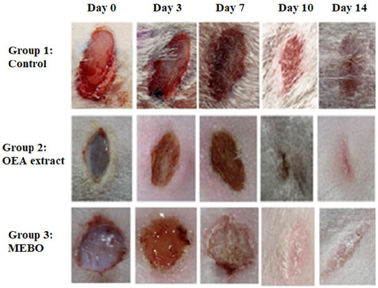In order to evaluate the effectiveness of OEA extract in healing wounds, excisional wound models were applied [42]. The extract was made for the wound models by dissolving OEA dry extract in carboxymethylcellulose (2 g of dried extract in 100 mL of 0.5% carboxymethylcellulose) and kept at 4 °C in the dark. Each test extract was applied topically to the wound site as soon as it was prepared [43].